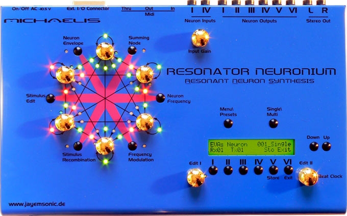 After 14(!) years I took great efforts to produce another small run of the Resonator Neuronium. Over the years there were repeatedly inquiries for this experimental synth, so that I decided to go and find the many obsolete and hard-to-get-parts and to make this unit exactly like in the first version from 2002-2004 again. Here you can order it: