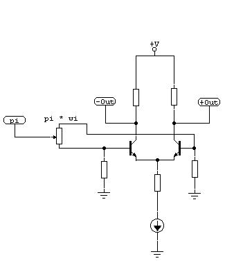 Um ein solches Neuron als analoge elektronische Schaltung darzustellen, bietet sich der simple Differenzverstärker geradezu an. Er verfügt über summationsfähige Eingänge, seine Großsignalübertragungsfunktion ist ein näherungsweise der Tangens Hyperbolicus und er kommt mit relativ wenigen Bauteilen aus.