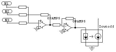 Die Potentiometereingänge können auf die praktische Anzahl der Neuroneneingänge beliebig erweitert werden. Sie bilden mit R1 einen Spannungsteiler, dessen oberer Zweig geregelt wird. Da sie als Längswiderstände beschaltet sind, dienen sie automatisch der Summation auf R1. Dadurch wird ein zusätzlicher Widerstand pro Knoteneingang gespart (Bauteilaufwand!). Der einzige Nachteil dieser Beschaltung ist, das niemals wi = 0 (entspräche Rpot = unendlich) oder negativ werden kann. Dazu später mehr.